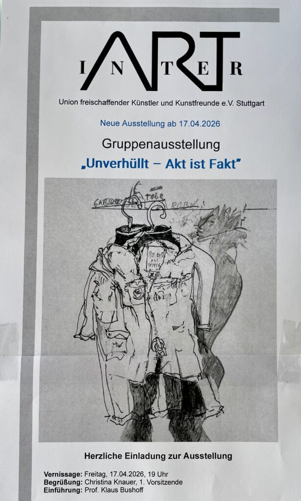 Als nächstes nehme ich an der Gruppenausstellung der InterArt Stuttgart – Unverhüllt … Akt ist Fakt sowohl mit Bild als auch mit Skulptur teil. Eröffnung ist am 17.4.2026 um 19 Uhr